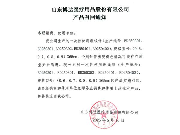 • 山東博達醫(yī)療用品股份有限公司 產(chǎn)品召回通知...